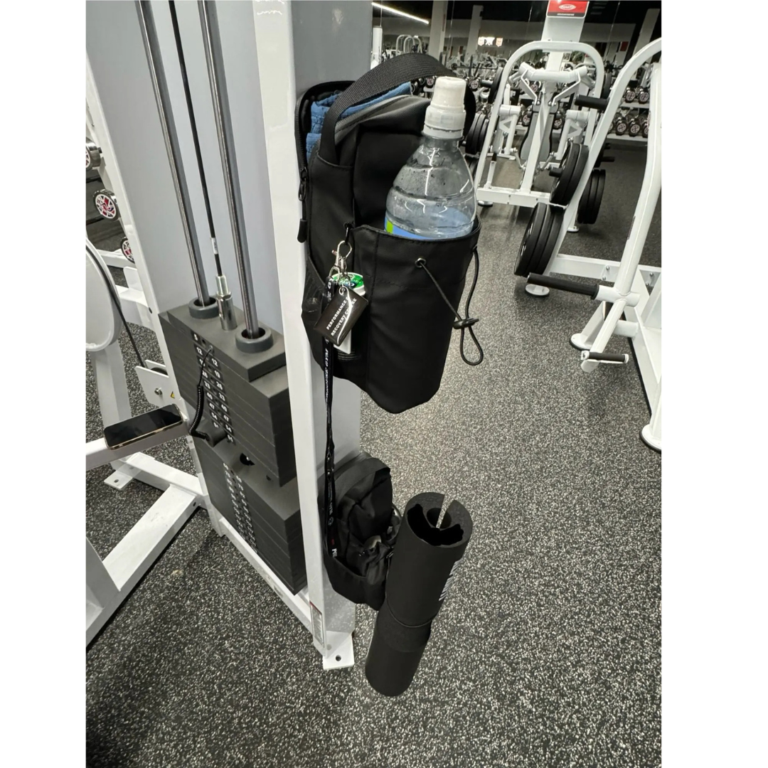 Works good, attached to all the gym equipment I tried it on. Plenty of room for a water bottle, headphones, gloves, phone, and other items.